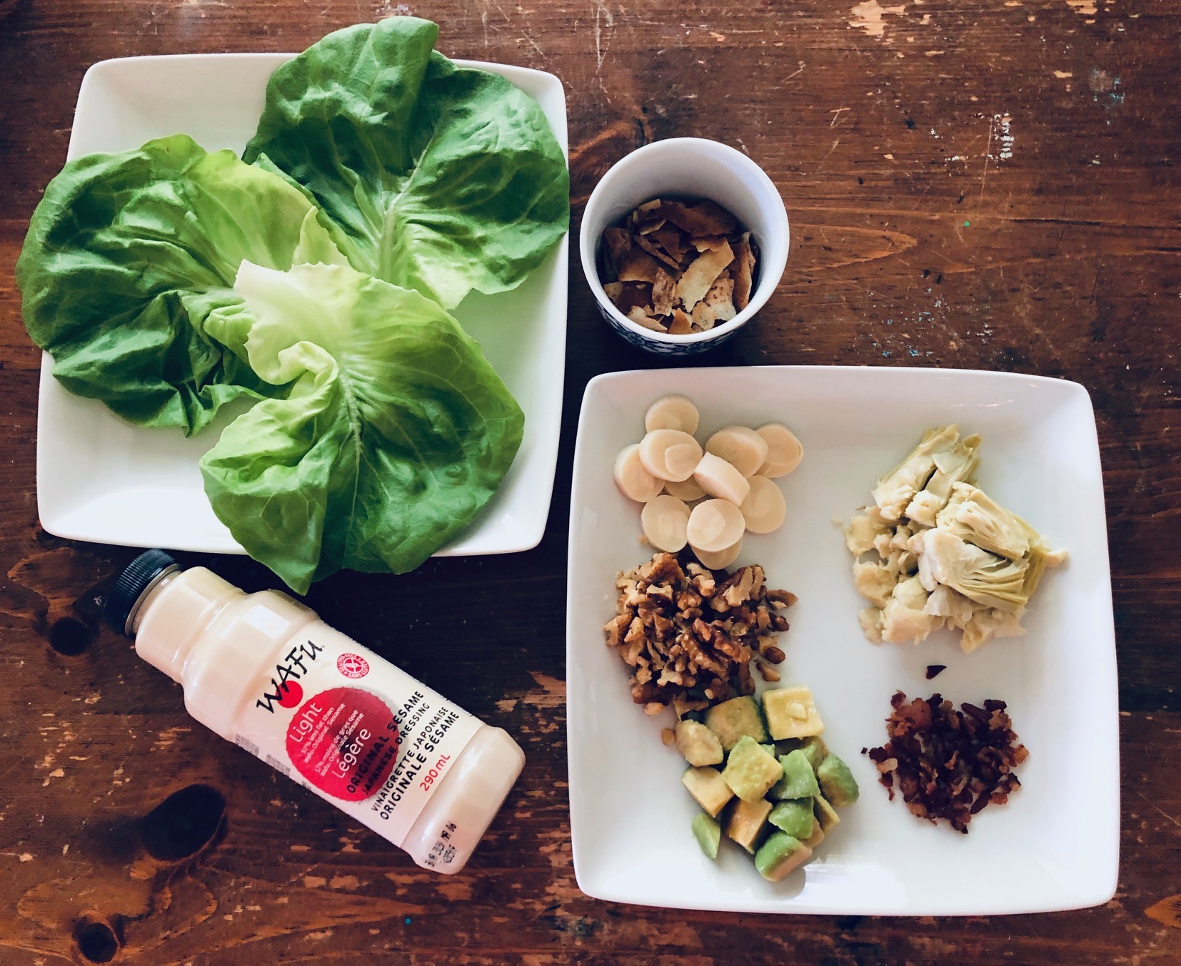 *Produit québécois vedette* : 4 c. à soupe de vinaigrette Wafu originale sésame. Il s’agit d’une délicieuse vinaigrette d’inspiration japonaise au goût de sésame! (Moi je prends la « légère », qui contient 43% moins de lipides que la version « originale »… je me sens moins coupable! 😉)