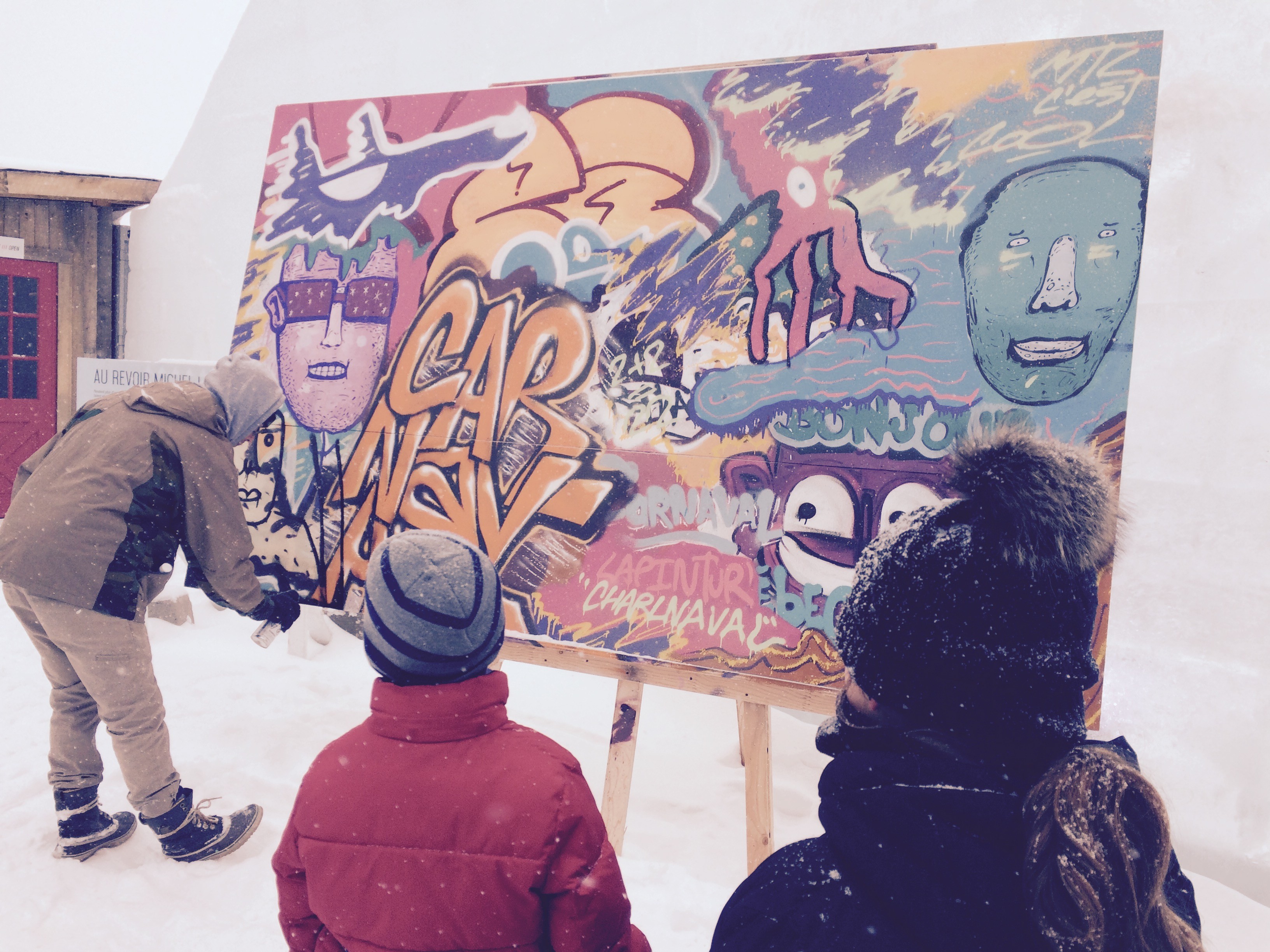 À la demande de mes enfants, qui avaient TROP HÂTE de voir le Palais de glace de Bonhomme, nous nous sommes illico rendus à la place de l’Assemblée Nationale, afin d’en faire la visite. Nous y avons notamment rencontré deux jeunes muralistes, qui travaillaient sur de superbes œuvres collectives de type graffiti!