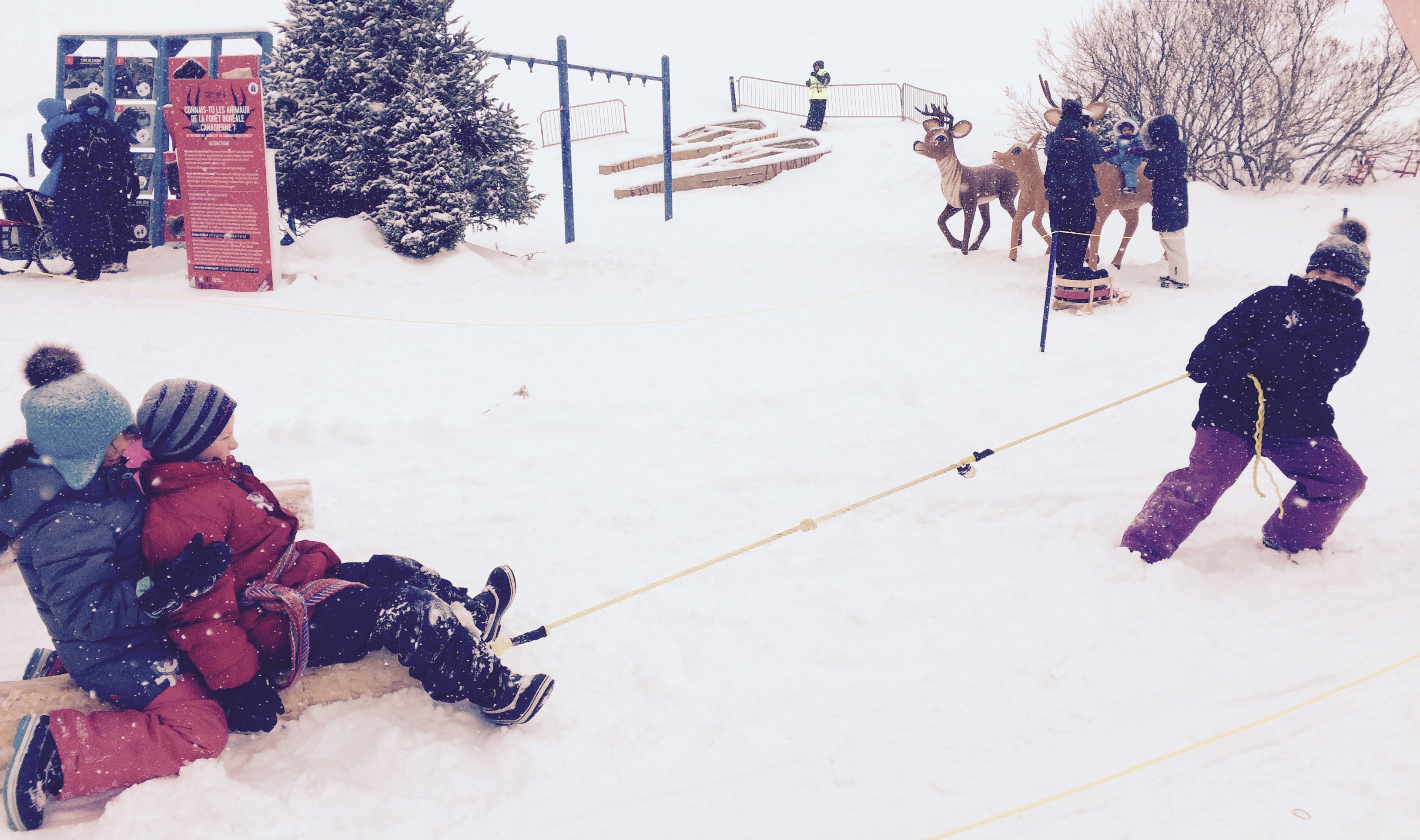 Premier dimanche matin du mois de février, mes trois enfants et moi nous sommes donc retrouvés sur la Grande-Allée, sous une belle petite neige qui rendait la température beaucoup plus clémente que la veille… Une journée parfaite pour jouer dehors!