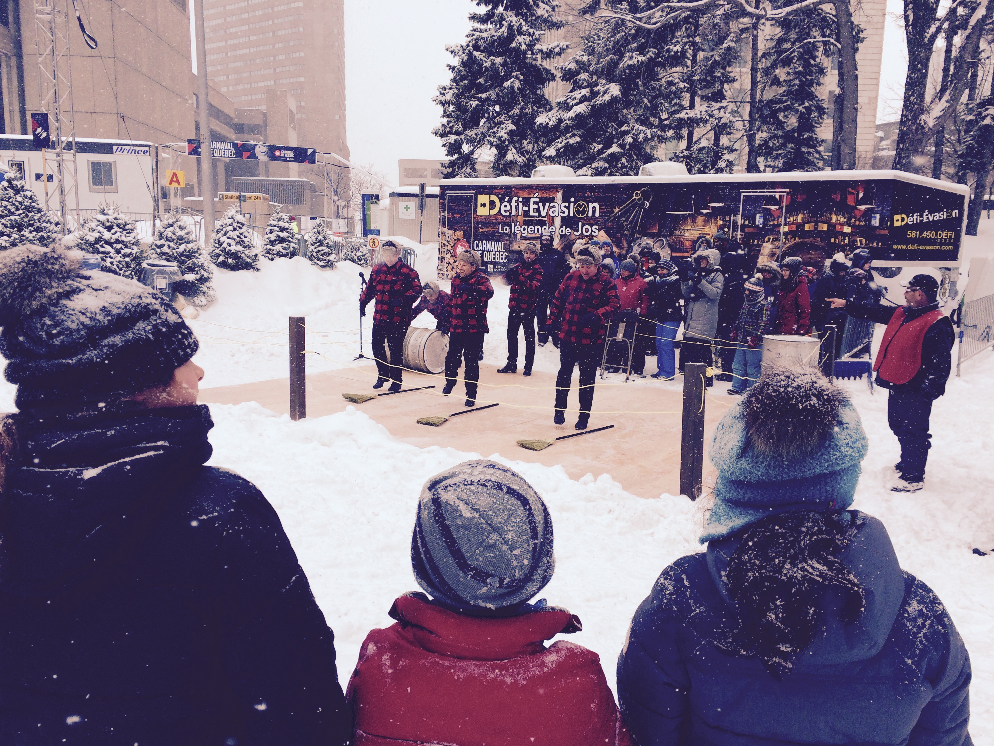 Après une petite joute de curling sur la Grande-Allée et quelques sculptures de blocs de glace à la Place Georges-V, j’ai eu un coup de cœur pour notre destination finale, le Camp à Jos, où régnait l’ambiance festive du Canada français d’antan! Jeux de camp, sciage de bois, lancer de la hache, musique traditionnelle qui donnait juste le goût de danser… J’ai d’ailleurs ADORÉ la prestation du groupe de gigue Les Jarrets Noirs… quelle énergie et quel talent!